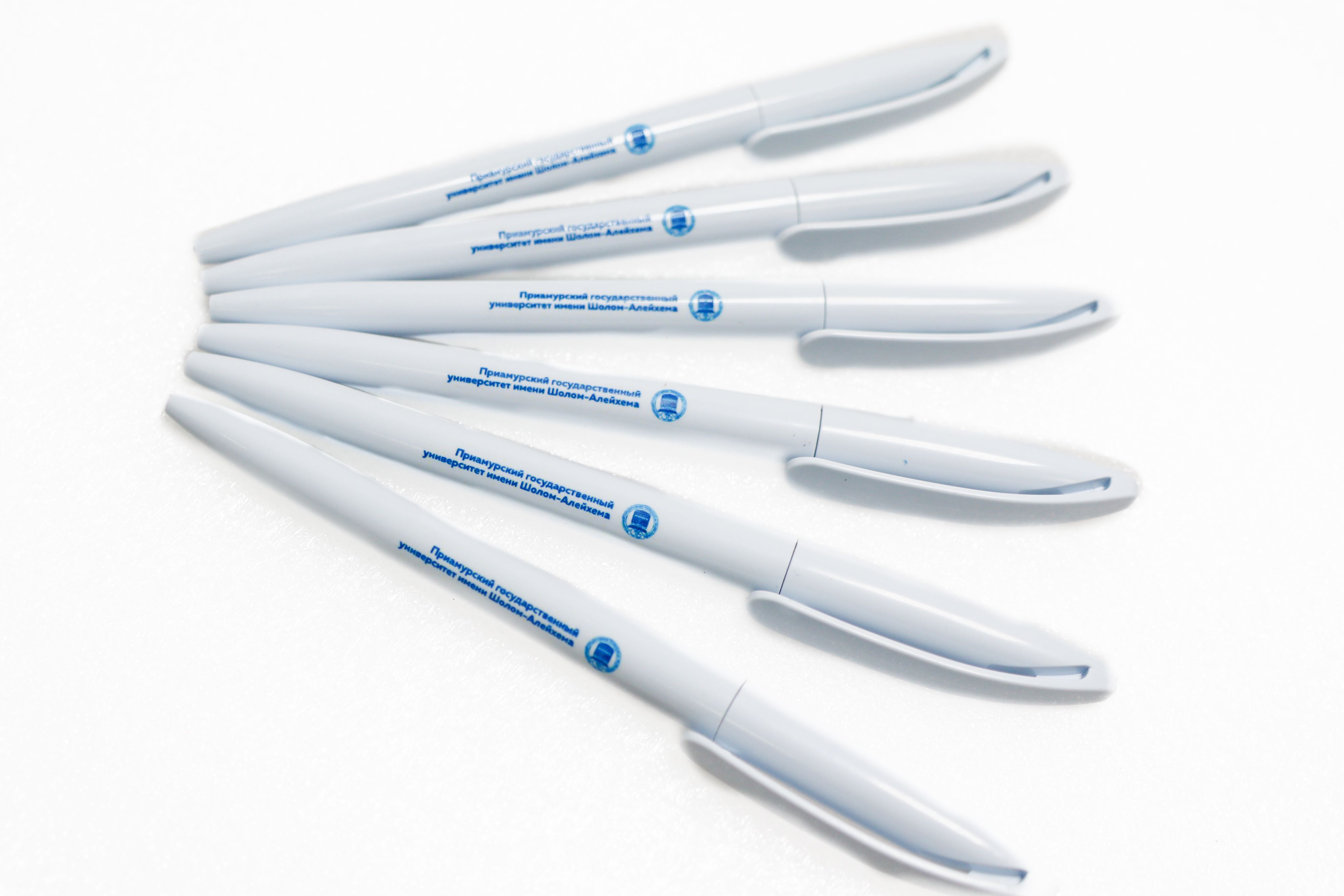 Ручка шариковая из белого пластика. На боковой поверхности напечатаны логотип и наименование университета Приамурского государственного университета имени Шолом-Алейхема